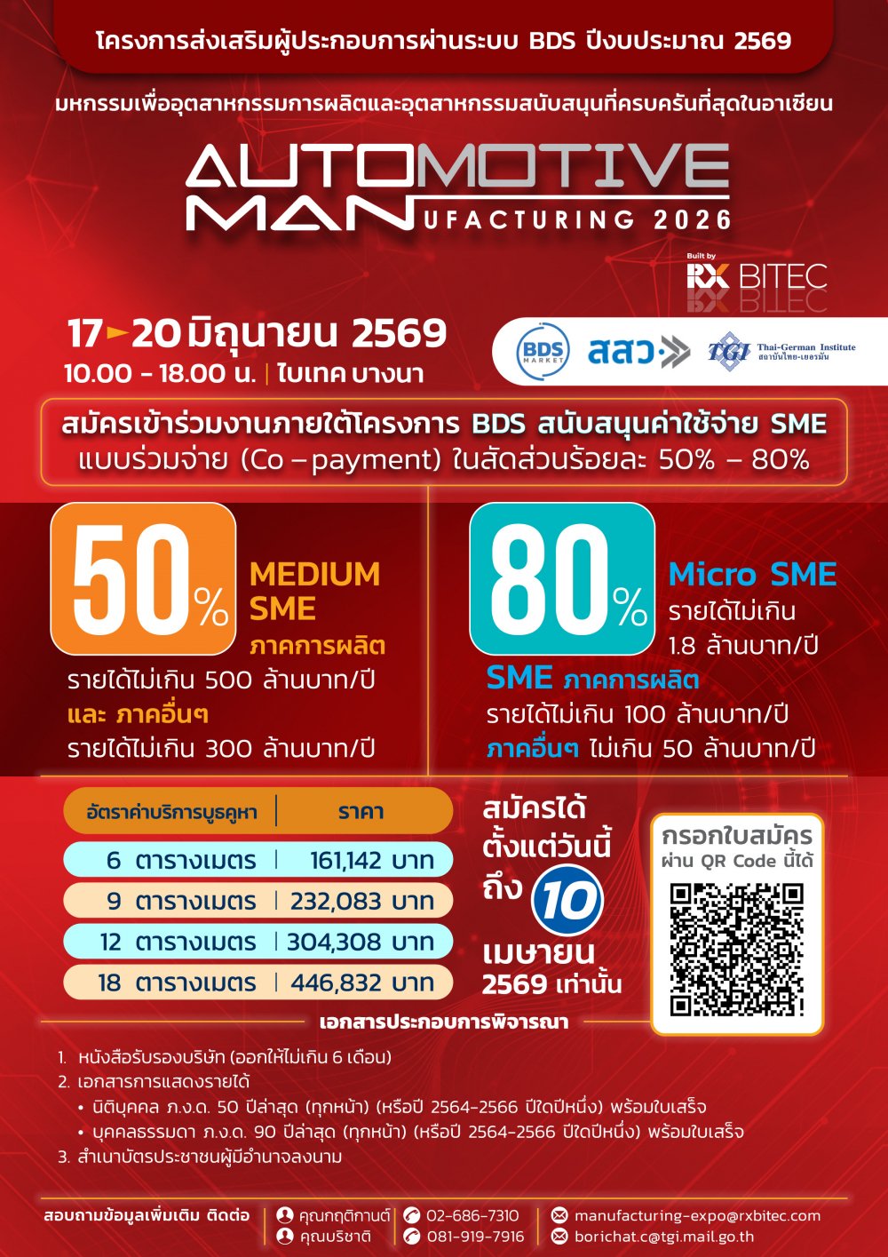 เรียนเชิญผู้ประกอบการ SME มาร่วมขยายเครือข่ายธุรกิจ พบคู่ค้าที่ใช่ ผ่านโครงการส่งเสริมผู้ประกอบการผ่านระบบ BDS ปี 2569 เพื่อรับสิทธิ์สนับสนุนค่าใช้จ่ายในการออกงานแสดงสินค้าออโตโมทีฟ แมนูแฟกเจอริ่ง 2026 สูงสุดถึง 80%! ตามขนาดของธุรกิจ