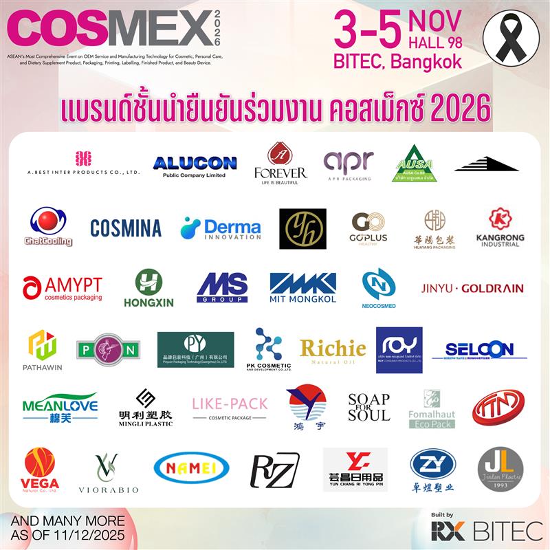 ได้เวลาพาแบรนด์ก้าวไกลกับลูกค้าที่ตรงเป้าหมาย เมื่อเข้าร่วมงาน คอสเม็กซ์ 2026 งานสำคัญประจำปีของวงการสุขภาพและความงาม ที่ผู้แสดงสินค้าจากกลุ่มผู้รับผลิต OEM, ผลิตภัณฑ์สำเร็จรูป, บรรจุภัณฑ์, การพิมพ์ฉลาก, อุปกรณ์เสริมความงาม และผลิตภัณฑ์ฮาลาล จะได้พบกับลูกค้าเป้าหมายนับหมื่นราย อาทิ เจ้าของแบรนด์ทุกขนาด ผู้ผลิต ผู้จัดจำหน่ายและผู้ค้าส่ง ผู้จัดซื้อจากแบรนด์ดังระดับโลก รวมถึงตัวแทนจากโรงแรมและธุรกิจเสริมความงามจากนานาประเทศ