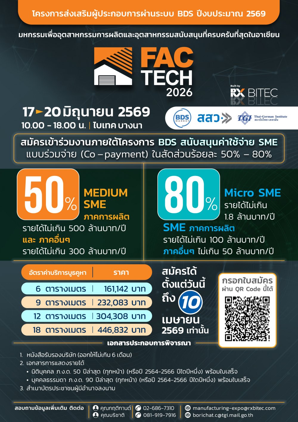 eNewsletter 2 เรียนเชิญผู้ประกอบการ SME มาร่วมขยายเครือข่ายธุรกิจ พบคู่ค้าที่ใช่ ผ่านโครงการส่งเสริมผู้ประกอบการผ่านระบบ BDS ปี 2569 เพื่อรับสิทธิ์สนับสนุนค่าใช้จ่ายในการออกงานแสดงสินค้า แฟ็กเทค 2026...