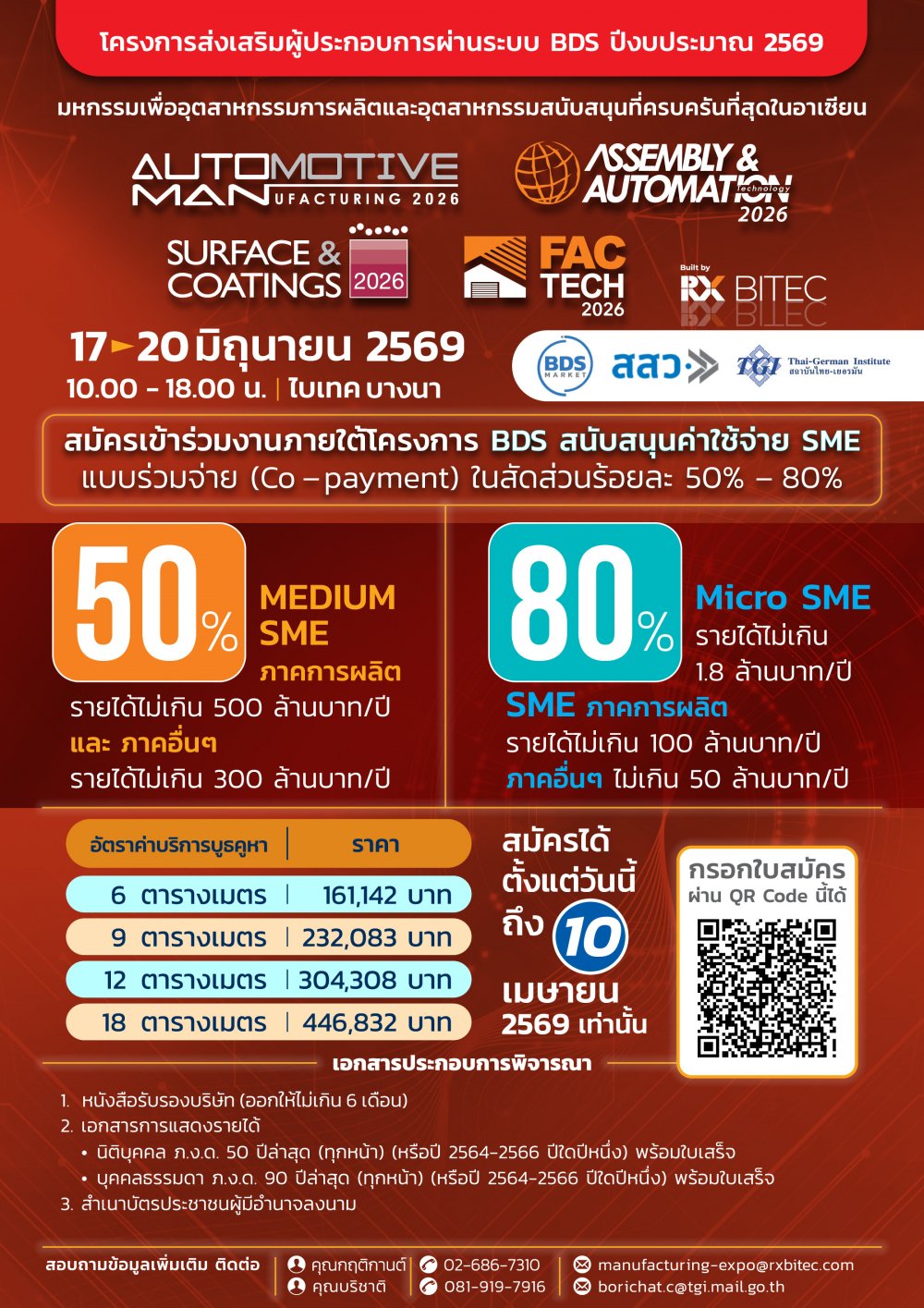 โอกาสดีปีละครั้งพร้อมแล้วสำหรับผู้ประกอบการ SME! ขอเชิญเพิ่มฐานลูกค้าในอุตสาหกรรมการผลิต จูนติดตลาดใหม่เพื่อขยายธุรกิจ กับโครงการส่งเสริมผู้ประกอบการผ่านระบบ BDS ประจำปี 2569 เพื่อรับสิทธิ์สนับสนุนค่าใช้จ่ายเข้าร่วมออกงานแสดงสินค้า โดยเลือกได้จากหนึ่งในสี่งานที่ตอบโจทย์สินค้าและบริการของคุณภายใต้แมนูแฟกเจอริ่ง เอ็กซ์โป 2026 ดังต่อไปนี้