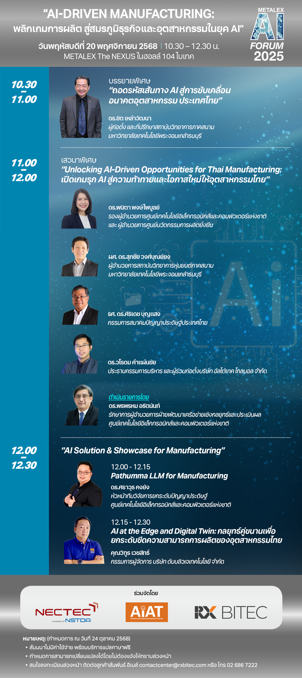 ขอเชิญผู้ประกอบการและผู้เชี่ยวชาญในภาคอุตสาหกรรมร่วมเปิดมุมมองใหม่ด้าน AI ในสัมมนา METALEX AI FORUM พบการบรรยายหัวข้อ “AI-Driven Manufacturing: พลิกเกมการผลิต สู่สมรภูมิธุรกิจและอุตสาหกรรมในยุค AI” จากผู้นำองค์กรและผู้เชี่ยวชาญด้าน AI ชั้นนำ อัพเดตแนวโน้ม เทคโนโลยี และการประยุกต์ใช้ AI เพื่อเพิ่มประสิทธิภาพ ความแม่นยำ และความยั่งยืนในโรงงานอุตสาหกรรม วันพฤหัสบดีที่ 20 พฤศจิกายน 2568 เวลา 10.30 – 12.30 น. ณ METALEX The NEXUS ในฮอลล์ 104 ไบเทค บางนา