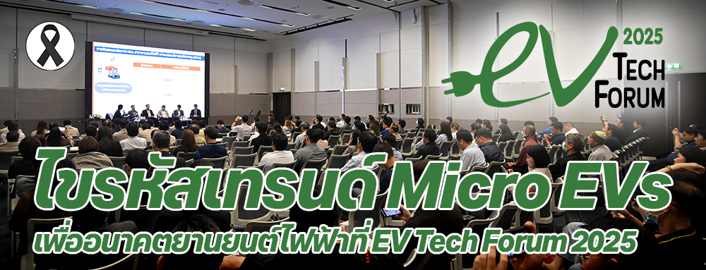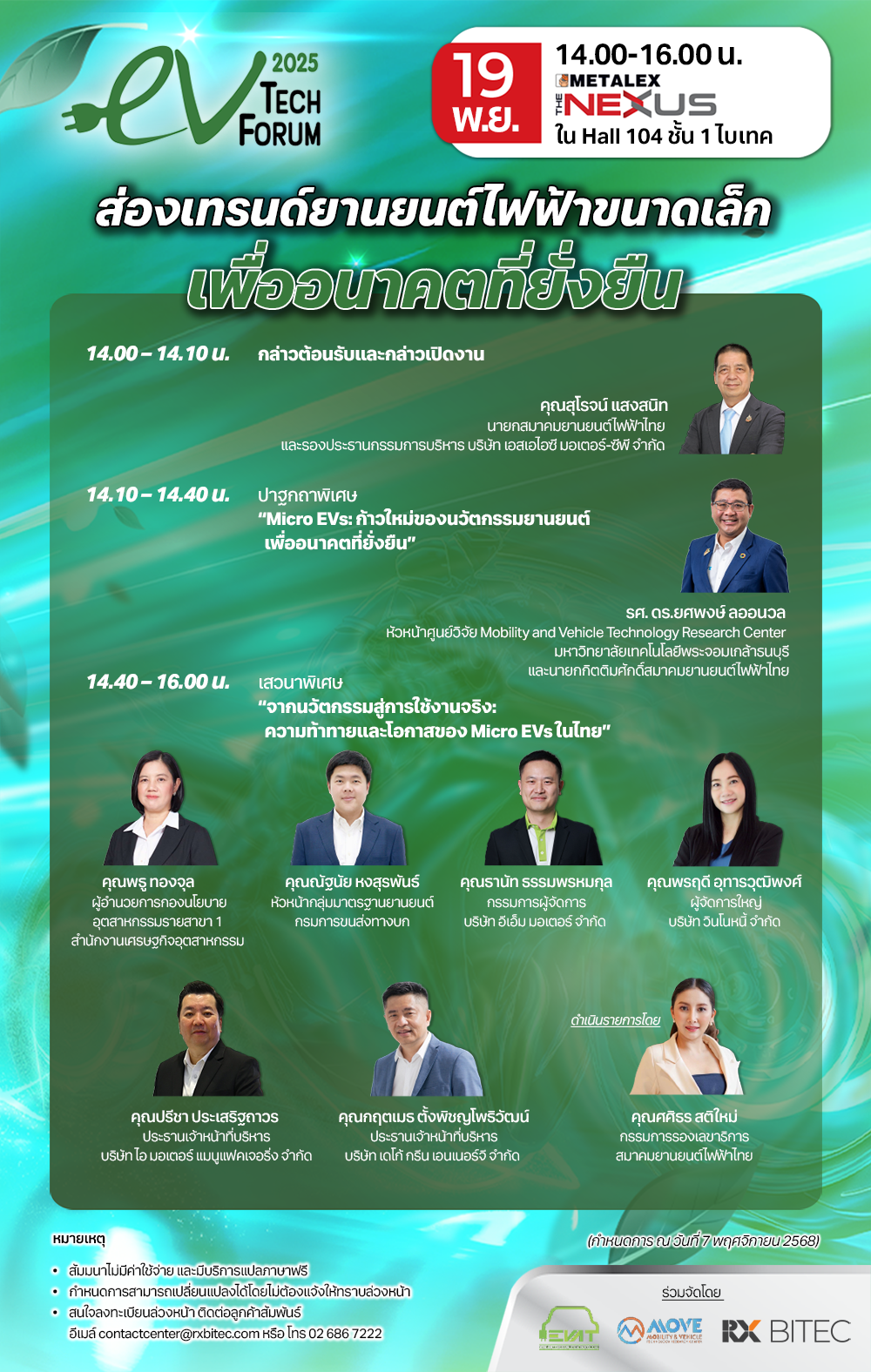 ก้าวสู่อนาคตยานยนต์ไฟฟ้าขนาดเล็ก (Micro EVs) ที่กำลังเป็นหัวใจสำคัญของการเดินทางในเมืองและเศรษฐกิจสีเขียว พบข้อมูลเชิงลึกด้านเทคโนโลยี โครงสร้างพื้นฐาน และโอกาสธุรกิจ พร้อมมุมมองด้านนโยบายสนับสนุนจากผู้เชี่ยวชาญตัวจริงใน EV Tech Forum 2025 วันพุธที่ 19 พฤศจิกายน 2568 เวลา 14.00–16.00 น. ณ METALEX The NEXUS ในฮอลล์ 104 ไบเทค บางนา