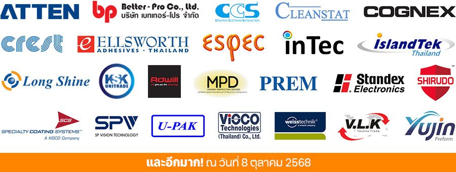 ผู้ให้บริการเทคโนโลยีและโซลูชันที่หลากหลายจากแบรนด์ระดับสากลเหล่านี้ยืนยันเข้าร่วมงานแล้ว ขอเชิญสำรองพื้นที่เพื่อร่วมกันผลักดันก้าวต่อไปให้ผู้ผลิตอิเล็กทรอนิกส์ไทย!