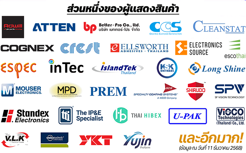 eNewsletter 4 ร่วมข้ามขีดจำกัดทางธุรกิจ พิชิตตลาดที่ใหญ่กว่าในภูมิภาคเพื่อสร้างเสริมธุรกิจที่เข้มแข็ง ร่วมกับผู้ให้บริการด้านเทคโนโลยีเพื่อการผลิตชิ้นส่วนอิเล็กทรอนิกส์ชั้นนำ ที่ยืนยันเข้าร่วมแสดงสิน...